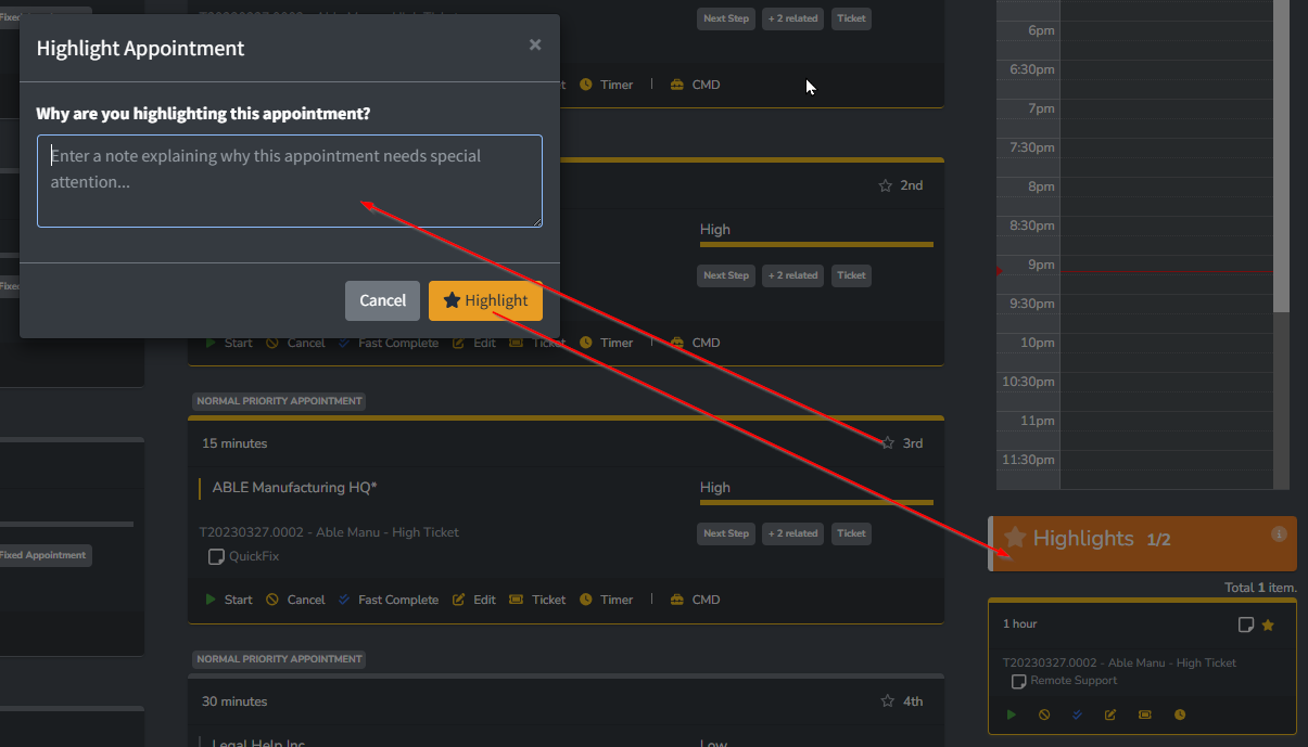 Click the Star icon to open the "Highlight Appointment" dialog.