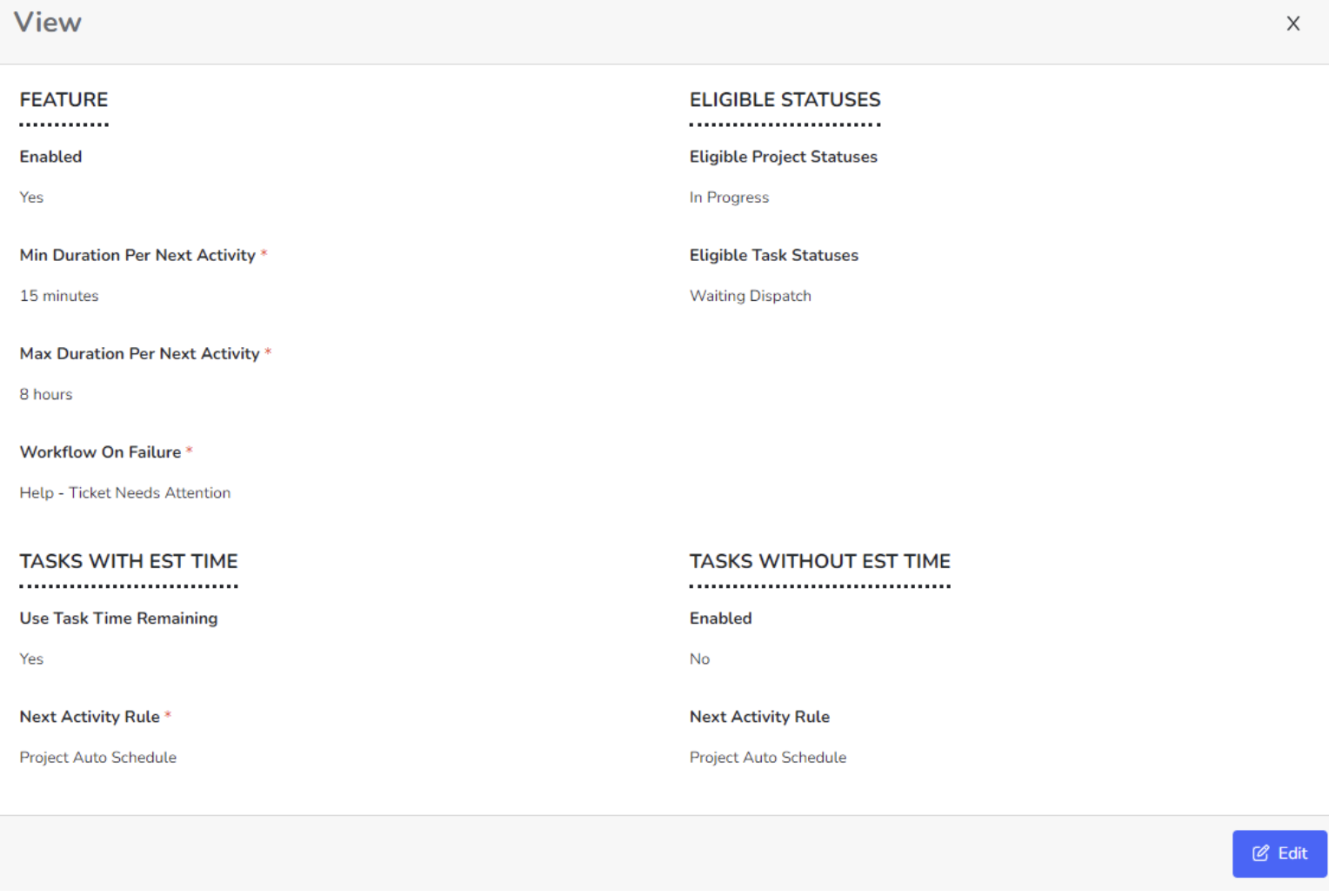 If the auto-scheduler fails for any reason, it will execute the Fail Workflow that is defined. By default, that is the same ‘Needs Attention’ workflow used by all other features. If the auto-scheduler is successful, it will trigger whichever workflow is linked to the default Next Activity Rule used in your settings (which defaults to the Rule ‘Project Auto Schedule’). You can create your own Next Activity Rule and link to it if desired.